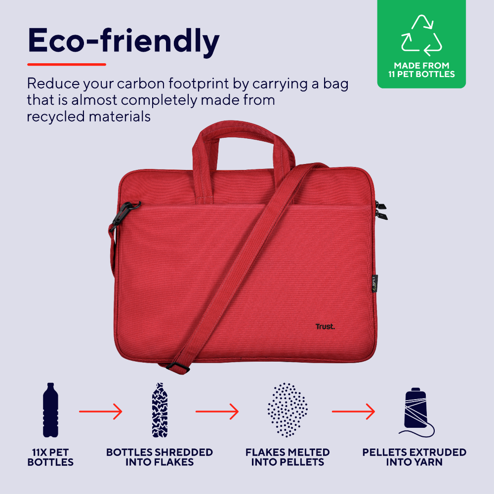 Maletín para portátiles fino y respetuoso con el medio ambiente, hecho de materiales PET reciclados; admite portátiles de hasta 16 pulgadas.