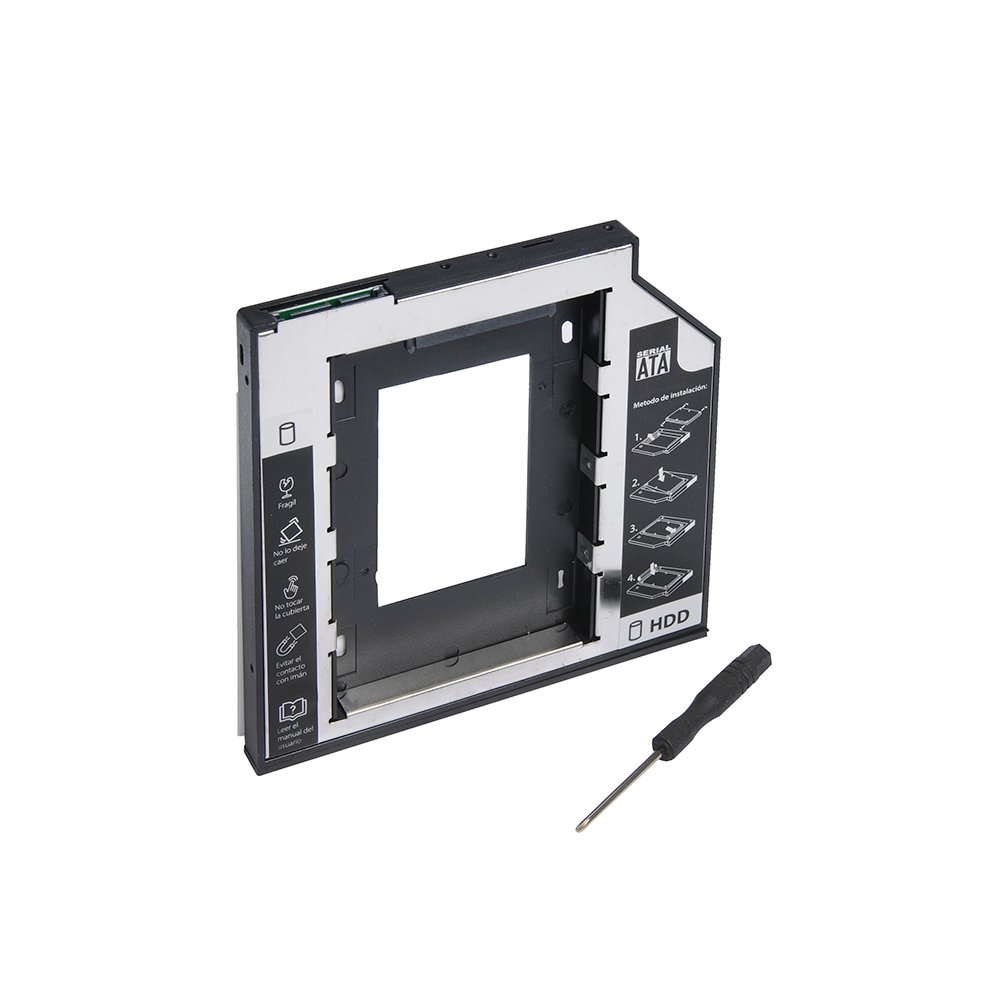 La estructura con el disco duro se inserta en la unidad de DVD/CD de la computadora portátil para hacer uso de él. -Plug & Play. Sistemas compatibles: Windows 7/8/10, Linux Fedora FC8, MAC OS 10.6.2. -Compatibilidad: SATA I, II, III. Adecuado para: 2.5″; 9,5 mm SSD/HDD.