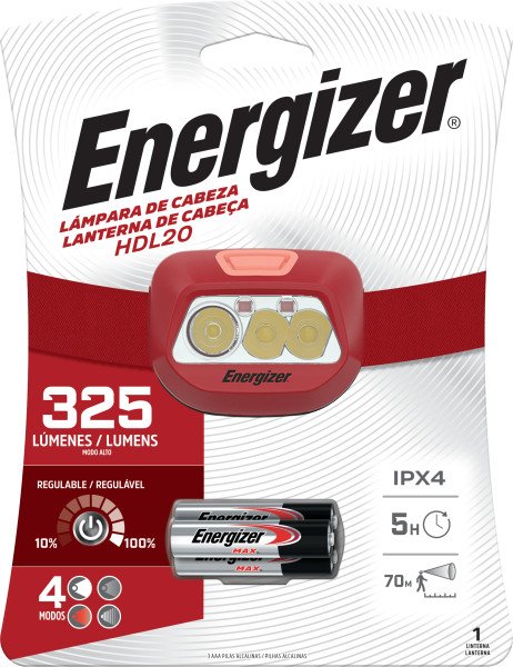 Linterna frontal LED Energizer 325 lúmenes, resistente al agua IPX4, lámpara de cabeza perfecta para camping, senderismo, construcción, luz de emergencia, 5 horas de duración y distancia de 70 mts.