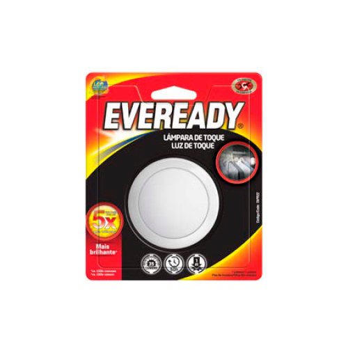 Lámpara de toque push on Eveready, diseñada para iluminar tus espacios interiores con 45 lúmenes de luz. Perfecta para habitaciones, armarios o gabinetes. Equipada con tecnología LED de bajo consumo energético y una base posterior autoadhesiva que se fija a cualquier superficie. Funciona con 2 baterías AAA (no incluidas).