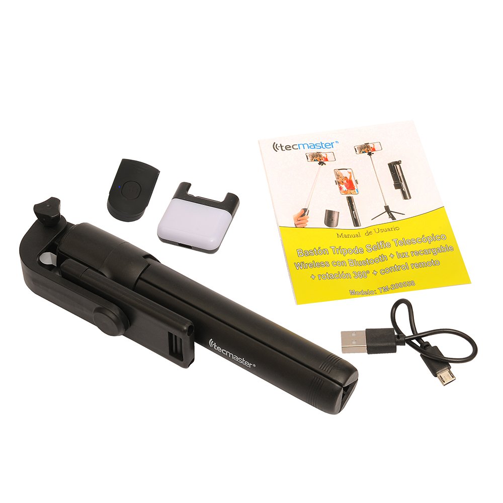 TECMASTER SELFIE STICK BLUETOOTH + TRIPODE + CONTROL REMOTO, NEGRO