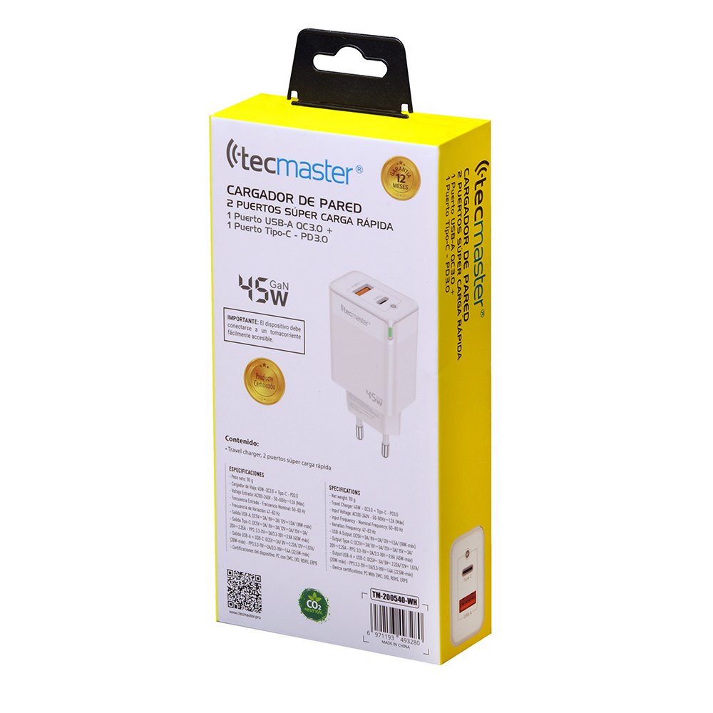 - Cargador de Viaje: 45W–QC3.0 + Tipo-C – PD3.0