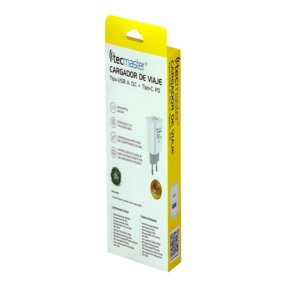 Tipo de puertos: USB A: Q.C + Tipo-C: PD Carga rápida 20W MÁX Tecnología Q.C 3.0 + PD súper carga Chip inteligente de carga se adapta automáticamente para una carga rápida y eficiente. El tipo C admite el protocolo de carga rápida, PD2.0 / PD3.0 USB admite el protocolo de carga rápida, QC2.0 / QC3.0, carga rápida