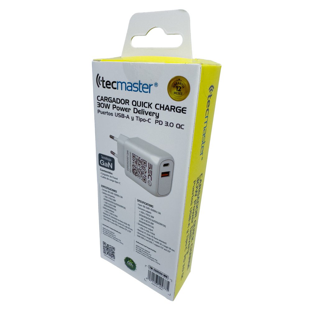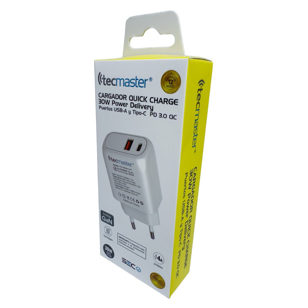 TECMASTER CARGADOR QUICK CHARGE 30W, PUERTOS USB-A Y TIPO-C PD 3.0